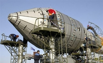 Workmen prepare the Galilieo (GIOVE-B) satellite of the European Space Agency on its launch pad at Kazakhstan's Baikonur cosmodrome, April 23, 2008. (Xinhua/AFP Photo, 4/27/08).