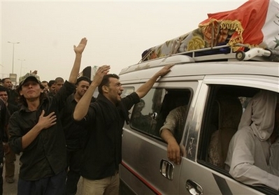 Above: Grieving Iraqi men (INA, 3/29/08). |